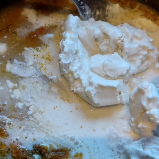 Remember the little bit of the remaining masala paste, that's what you will need, plus half tin coconut milk, and 2 tsp of red or green curry paste.